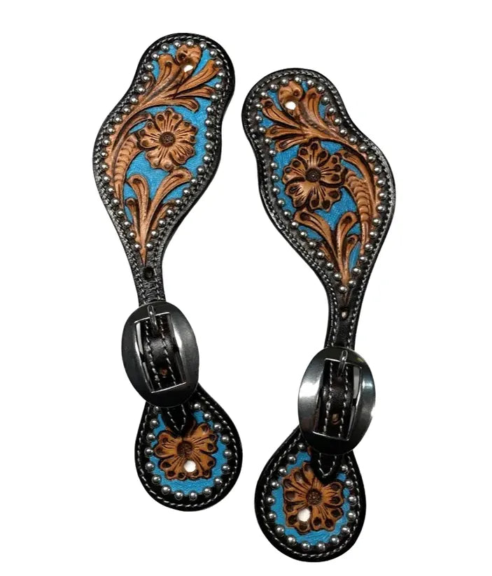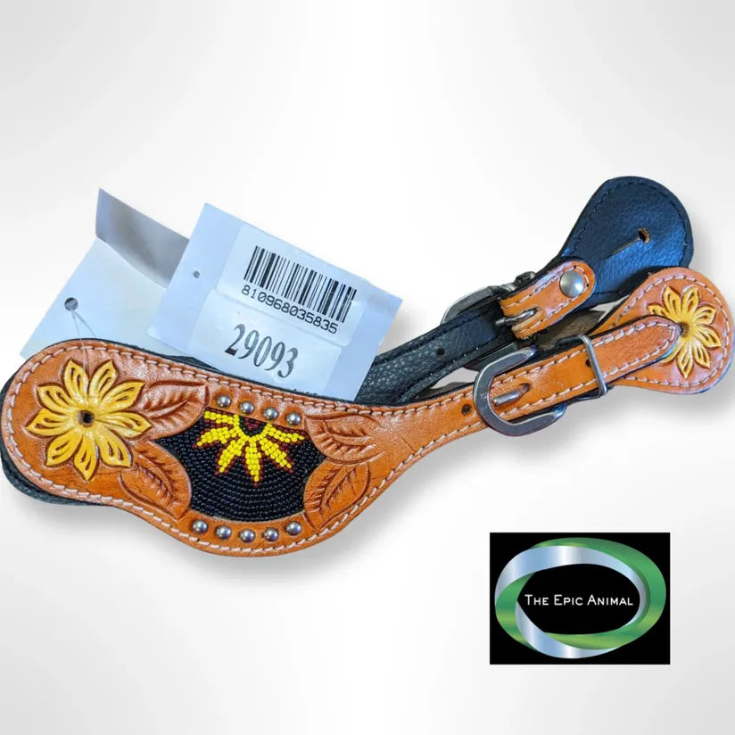 Spur Straps Leather Tooled with Beads and Stainless-Steel Buckle #29088