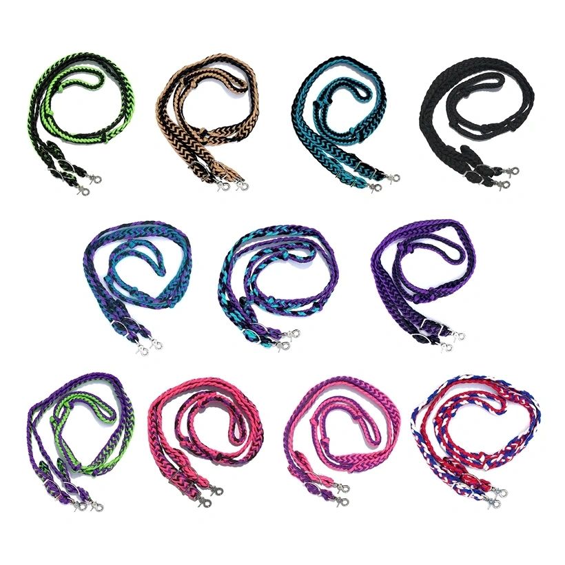 Braided Barrel / Roping Reins (12 Pack Assorted Colors) 8 ft with 2 nickel-plated scissor snaps & Conway buckles on each end to adjust the reins to a perfect length and knots to mark hand locations. Item #55000