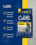 Calitti® EXTREME Unscented is an extra strength clumping cat litter. It is made from 100% natural bentonite, which absorbs fluids effectively and prevents the formation of bad odors. It quickly forms solid and easy-to-remove clumps, making cleanup extremely easy. The fine grains are gentle on cat paws and do not stick to them. Special activated charcoal granules absorb unpleasant odors, keeping the litter box fresh for even longer.