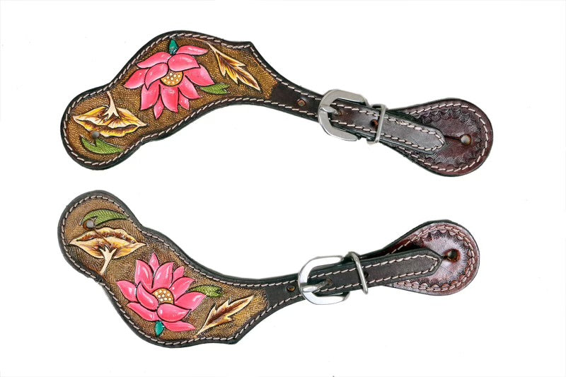 Full grain leather western spur straps with hand-tool design with painted Flower design.