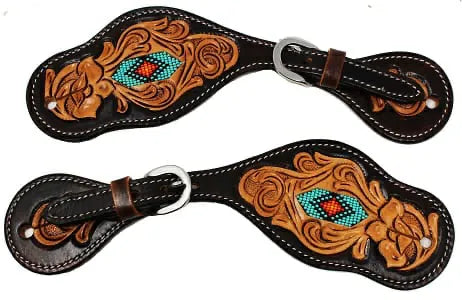 Spur Straps Leather Tooled with Beads and Stainless-Steel Buckle #29088