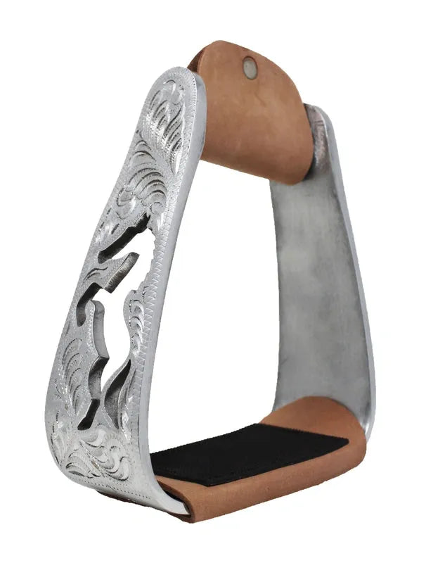 Western stirrups made of durable aluminum. Beautifully engraved outer sides accented with standing horse cut-out. Leather covered accents with a rubber grip tread to help with slippage.